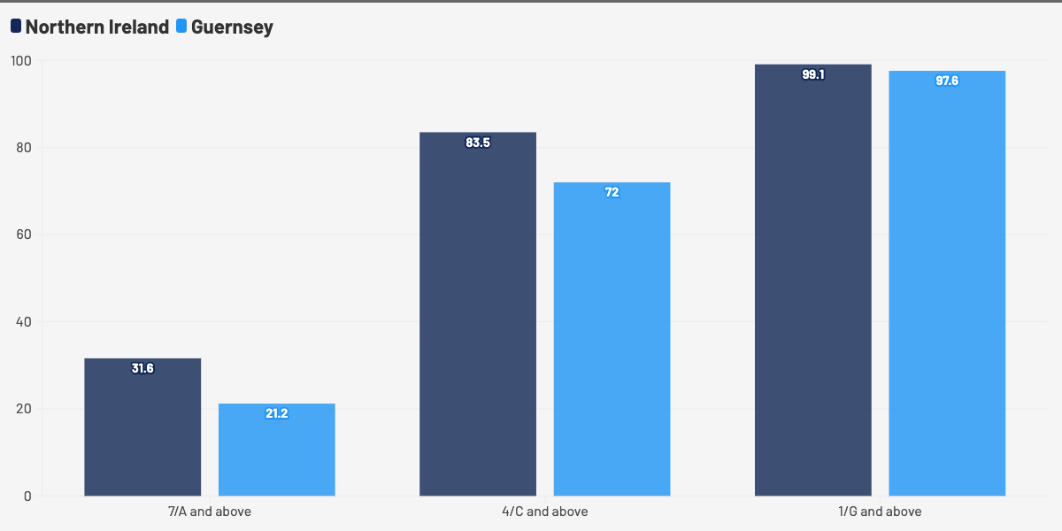 Breaking down the overall results by grade shows that Guernsey’s percentage pass rate falls behind the English national average once it hits 7, the equivalent of an old A, and above: 21.2% compared to 21.7%. In the south east the rate is 27.7% at these levels and in Greater London 28.2%. Northern Ireland hits 31.6%.