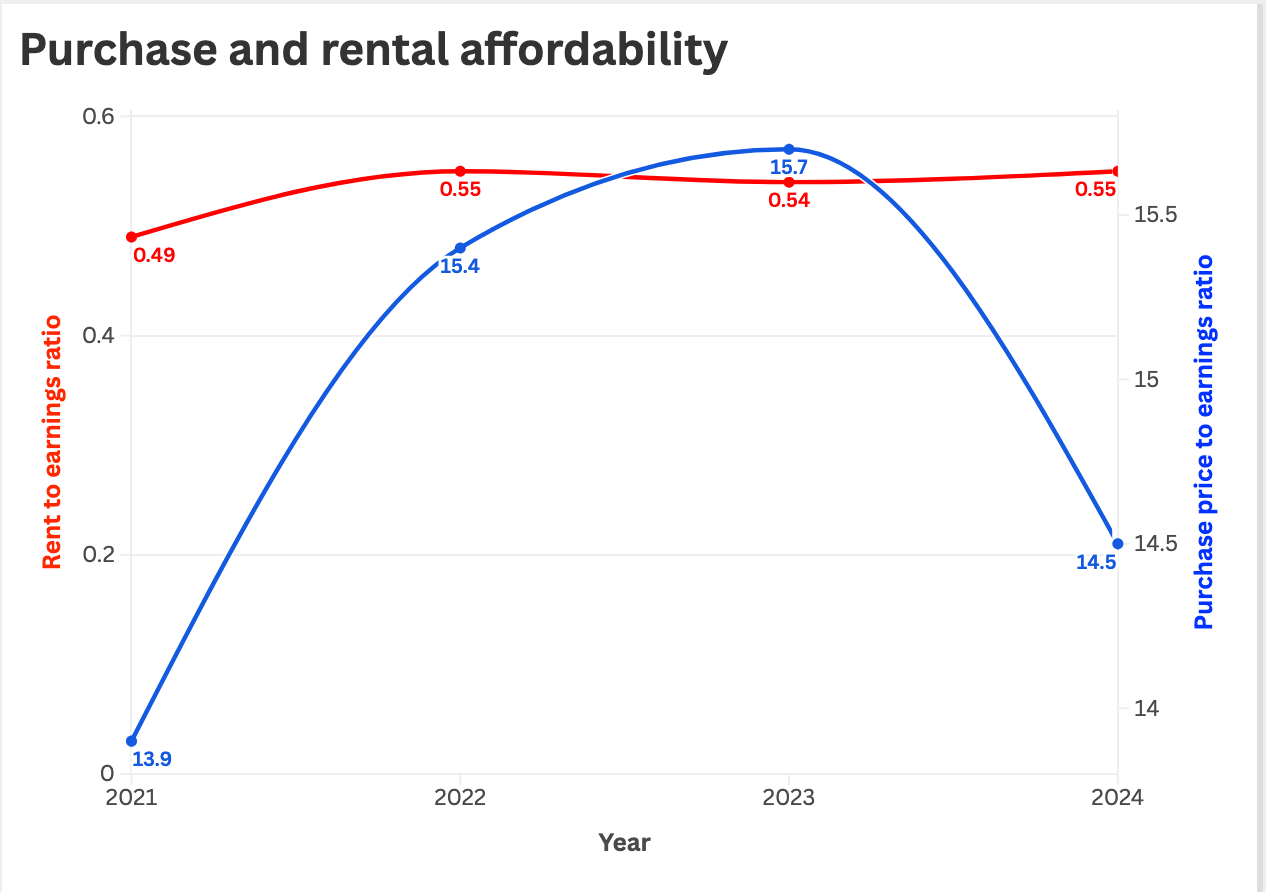 - Median earnings distortion: The latest available median earnings figures (March 2024) may have been artificially inflated in prior years (e.g., 2020 and 2021) due to the loss of a disproportionate number of lower-paid roles during the COVID-19 period. This can affect the perceived severity of the purchase and rent to earnings ratios.
