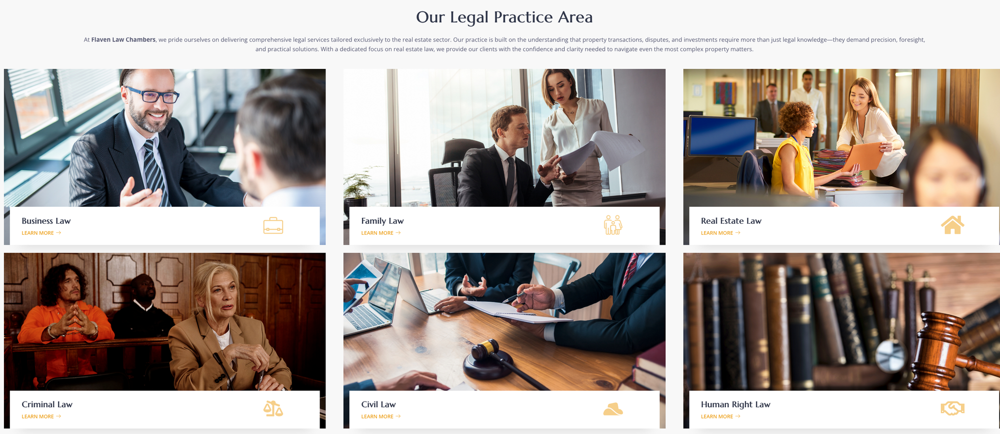 Content across the site is generic and non-specific, describing broad areas of law—including civil, criminal, corporate, real estate, and human rights—without reference to jurisdiction, casework, or applicable legal frameworks.