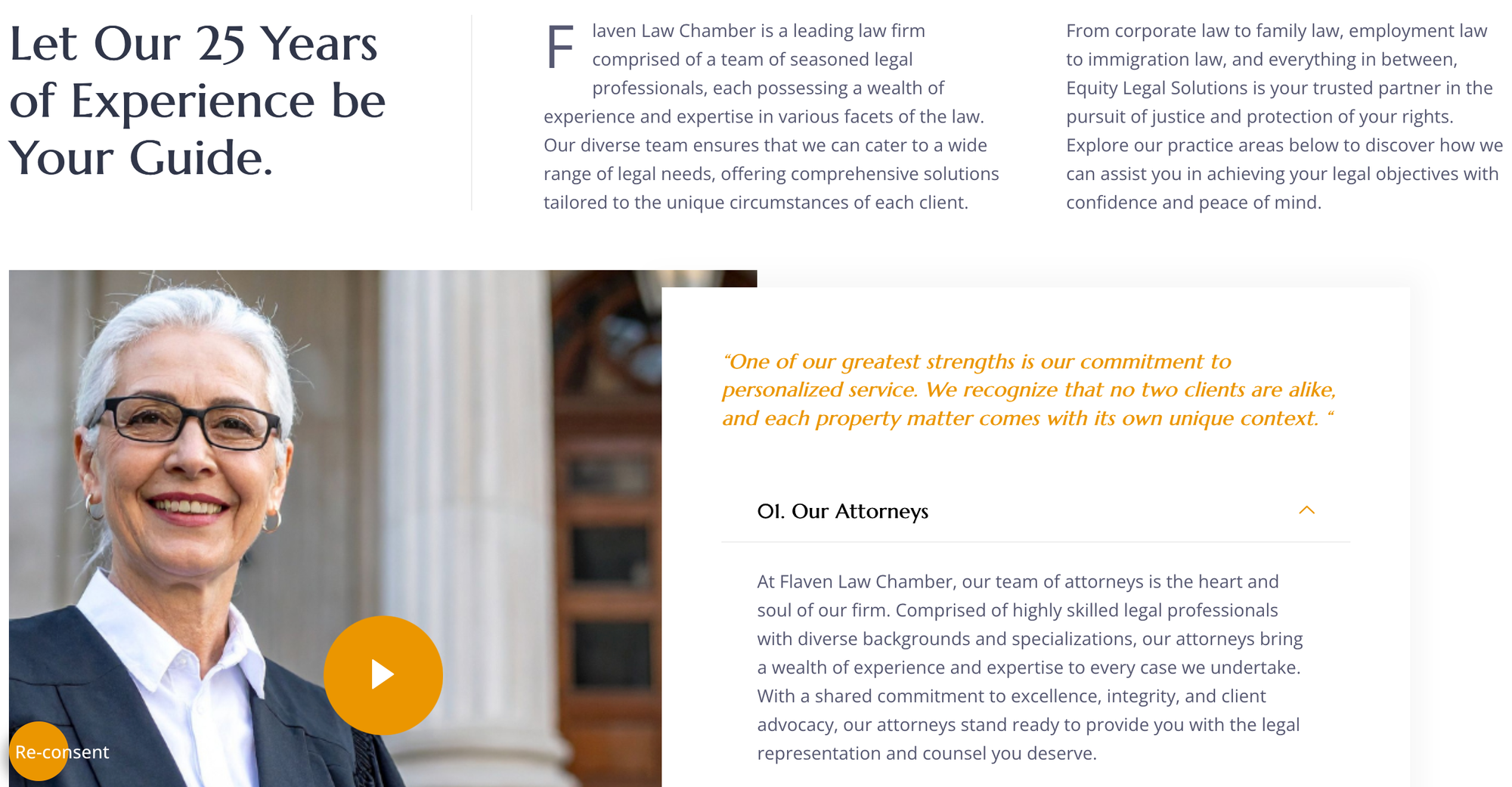 Further inconsistencies appear in the site’s internal structure. References to unrelated entity names suggest reuse of pre-existing templates, while numerical claims regarding years of experience and case success rates are presented without attribution or supporting evidence. Testimonials are similarly non-verifiable, lacking identifiable individuals or associated matters.