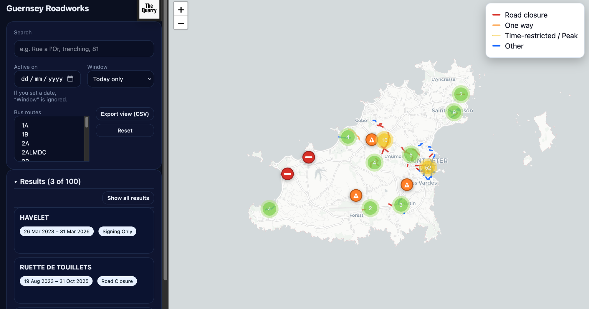 This map is based on data from gov.gg and is updated weekly. For detailed bus information visit here. Emergency roadworks information is available here.