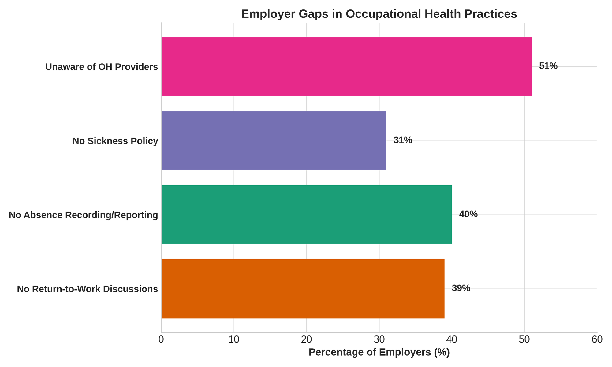 A recent employer survey has revealed key gaps in support: nearly 40% of businesses do not hold return-to-work discussions after employee illness, and 51% have never engaged with occupational health services—often due to lack of awareness.