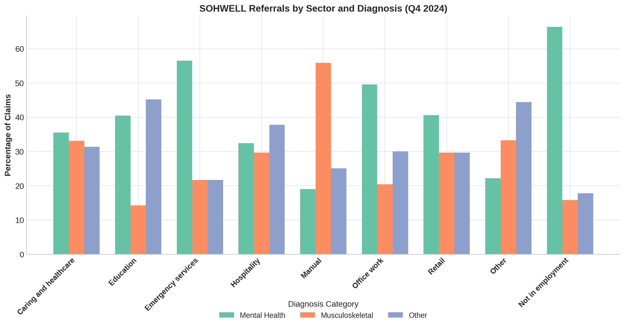 In 2024 alone, 1,206 claims were managed by SOHWELL case workers. Of the 966 resolved, 65% returned to work, and many did so on a phased or supported basis.