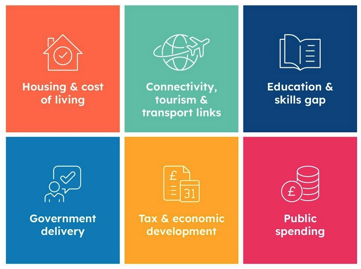 When they surveyed their collective memberships, a series of interconnected areas to focus on was consolidated: housing and the cost of living; connectivity, tourism and transport links; education and skills gap; government delivery; tax and economic development; public spending.